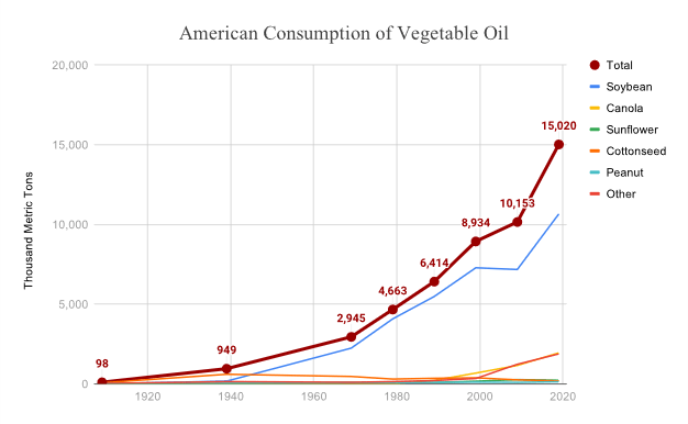 Medan den grandiosa skolmedicinen med alla sina medicinprofessorer inte tycks begripa någonting, är orsakerna bakom den metabola pandemin fullständigt uppenbara för oss som sysslar med alternativmedicin. Skolmedicinens helt ovetenskapliga kampanj mot kolesterol och mättade fetter från såväl animalier som kokosolja har passat livsmedelsindustrin som hand i handske. Med denna kampanj som alibi, har man ersatt de dyrare och mer svårhanterliga naturliga fetterna i människofödan med mycket billiga raffinerade fröoljor, socker och spannmål. Som framgår av det rubricerade diagrammet har konsumtionen av vegetabiliska oljor ökat 150 ggr från förra sekelskiftet och sedan brytpunkten 1980 har den femfaldigats. Detta har skett efter starka råd från såväl nutritionsmyndigheter som skolmedicinen att ersätta de naturliga animaliska fetterna med just vegetabiliska fetter.