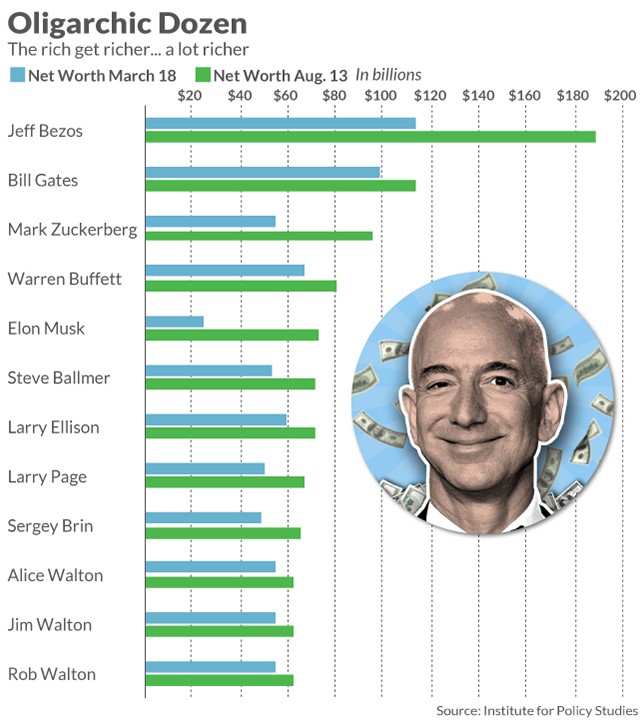 Mellan den 18 mars till den 13 augusti har USA:s tolv rikaste oligarker ökat sina förmögenheter med ca 300 miljarder USD. De har blivit 40% rikare. Idag uppgår den samlade förmögenheten hos dessa till hissnande 1.000 miljarder USD. Det motsvarar den samlade BNPn hos Belgien och Österrike. Med detta följer en enorm ekonomisk och politisk makt i händerna på personer utan all demokratisk legitimitet.