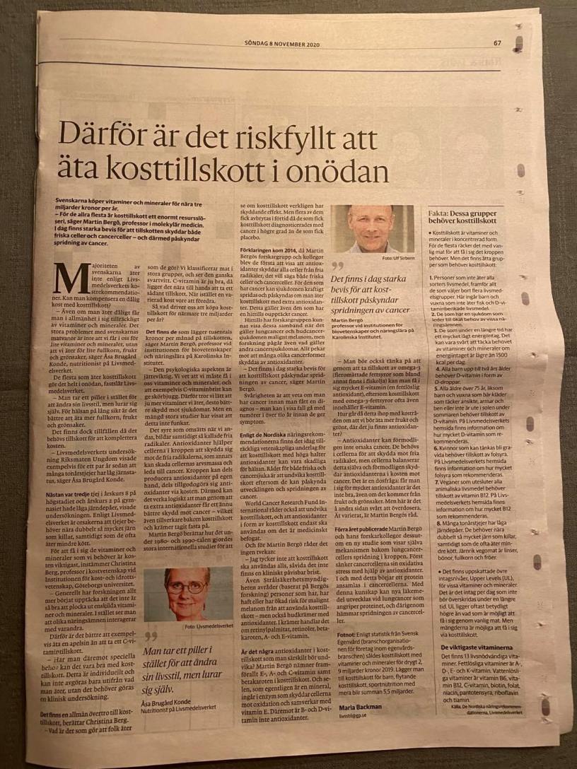 En bekant till mig som opererats för en pancreacancer och fått cellgiftsbehandling efter, blev av sina läkare tillhållen att absolut inte ta några vitaminer eller andra kosttillskott ett halvår efter behandlingen, ett totalt vansinnigt råd. Vederbörande fick redan efter några månader tecken på en fortsatt cancerutveckling och dog några månader senare. Denna typ av instruktioner från skolmedicinen står, vad jag kan förstå, helt i strid med vetenskapen på området.