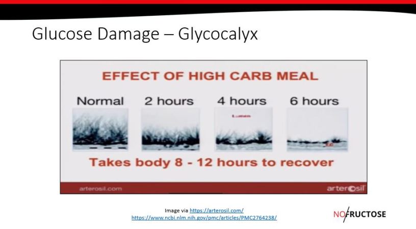 Glukos skadar glykokalyxen, inte bara från långsiktig hög kolhydratkonsumtion, utan även från en enda stor måltid med mycket glukos. Att äta mycket kolhydrater i en måltid eller i de flesta måltider, som i en typisk amerikansk kost, blir detsamma som att äta socker och alla sötade livsmedel, majs och stärkelse, de flesta frukter, juice och läsk. Det orsakar en stor glukosbelastning i blodet. Högt intag av glukos/kolhydrat skadar glykokalyxen så att den förstörs mer eller mindre. De flesta processade livsmedel innehåller ofta socker, majs och stärkelse, så de uppfyller alltså denna kategori även om de är konserver av kött eller grönsaker.