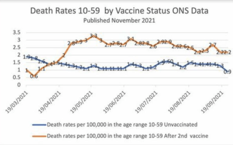 Av vaccinerade engelska vuxna under 60 år dör dubbelt så många som ovaccinerade i samma ålder