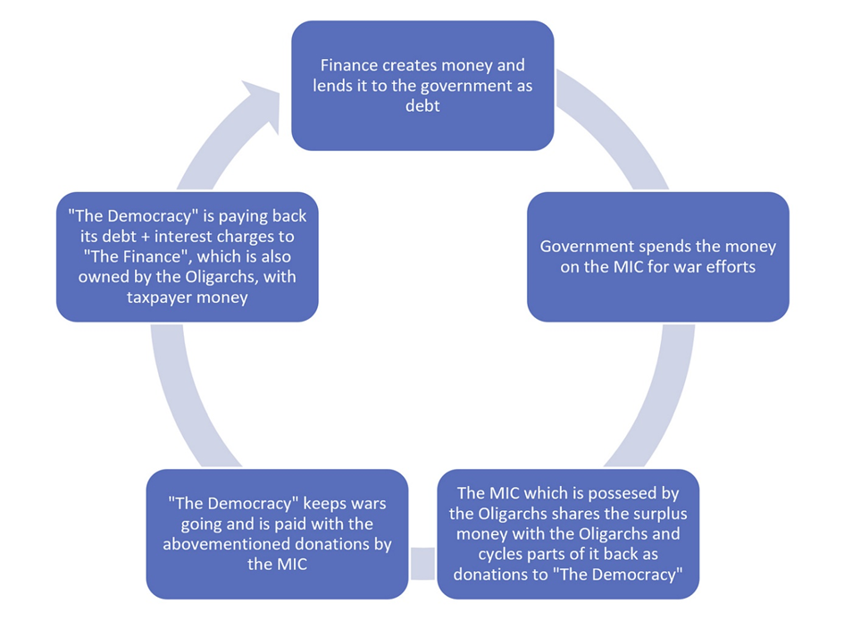 I grund och botten är det ett mål som ni måste jaga efter, och under processen genererar ni hela den rikedom, skattebetalarnas pengar och skulder, som behövs för att hålla krigscykeln igång. Missförstå mig inte, det finns inget dåligt med att vilja bli rik, äga ett företag eller bli rik. Det är helt i sin ordning. Jag är inte annorlunda.
