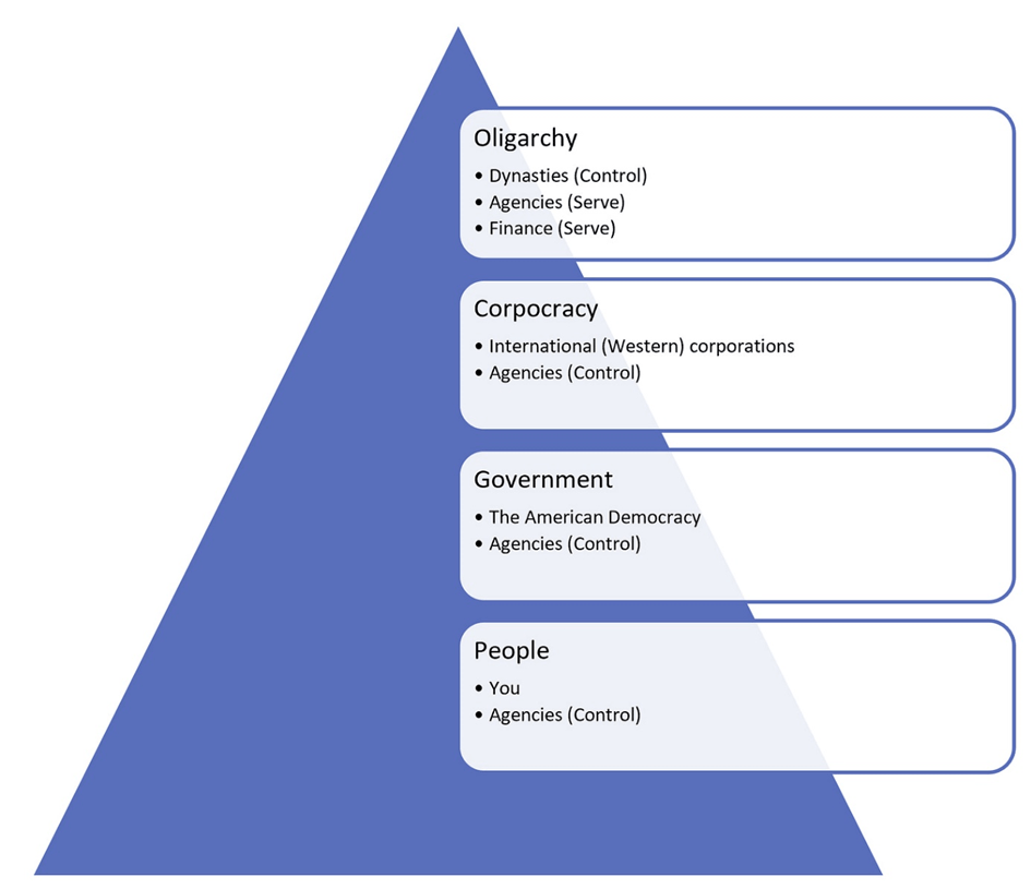 Korpokratin är helt enkelt en ansamling av de stora USA-baserade företagen som är verksamma över hela världen. I själva verket är de internationella (västerländska!) företag. Oligarkin är också internationell (västlig!), vilket är mycket viktigt att förstå. Imperiet och allt som händer är inte orsakat av det amerikanska folket. De är också offer. Det orsakas av den internationella (västerländska!) Oligarki, som använder USA och dess folk (soldater) som en murbräcka mot resten av världen.